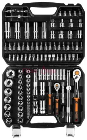 Nástrčkové kľúče ¼", ½", sada 110 kusov, CRV, 10-066 NEO je kvalitná sada až 110 kusov produktov ponúkaná v pohodlnom plastovom kufríku s kovovými západkami a praktickou rukoväťou. Vertikálne umiestnenie prvkov v ňom zaručuje väčší komfort používania a rýchlejší zber potrebného príslušenstva. Sada obsahuje nasledujúce nástroje a príslušenstvo: